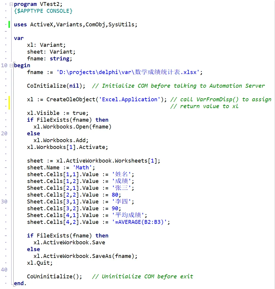 关于 Delphi 的变体类型,我们说主要是用来与外部世界打交道的。今天我们就来讨论一下 Delphi 代码操作 Excel 的问题。微软的 Office 软件有一个非常好的特点,就是可以通过程序代码对软件的各个部分进行操作,特别是 Excel,由于 Excel 主要是用来处理数据,所以特别适合通过代码来操作。Excel(以及其他 Office 的组成部分)之所以能够通过代码来操作,是因为微软的一项特别技术:OLE Automation。原则上,只要一个软件支持 OLE Automation,就可以通过代码(VB/VBA、Delphi、C/C++)来操作该软件。当然 OLE Automation 是一项比较复杂的技术,我们今天不深入技术细节,主要是讨论 Delphi 如何通过 OLE Automation 来控制 Excel。Excel 通过 IDispatch 接口将其内部的对象呈现给外界,而 Delphi 代码通过这个接口可以访问 Excel 暴露出的对象,从而通过调用这些对象的方法来操作 Excel。那 Delphi 通过什么样的数据类型来保存 IDispatch 接口并进而通过该接口访问相关的对象呢?答案是:变体类型。Delphi 的变体类型可以接纳 varDispatch 类型,而这个就是 OLE Automation 的 IDispatch 接口类型。这个简单的例子是生成一张 Excel 数学考试成绩单。程序一开始,首先声明两个变体类型的变量,xl,用来代表Excel 的 Application 对象,sheet,用来代表 Excel 的当前表单。因为 Excel 是一个 OLE Automation 服务器,它的运行需要 COM 的支持,所以操作 Excel 的 Delphi 代码要在程序开始时启动(CoInitialize) COM,程序结束时终止(CoUninitialize) COM。启动 COM 以后,就可以通过 CreateOleObject 来启动 Excel。CreateOleObject 是创建 OLE Automation 服务器对象的标准函数,其声明如下:functionCreateOleObject(const ClassName: string): IDispatch;
