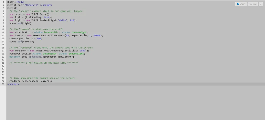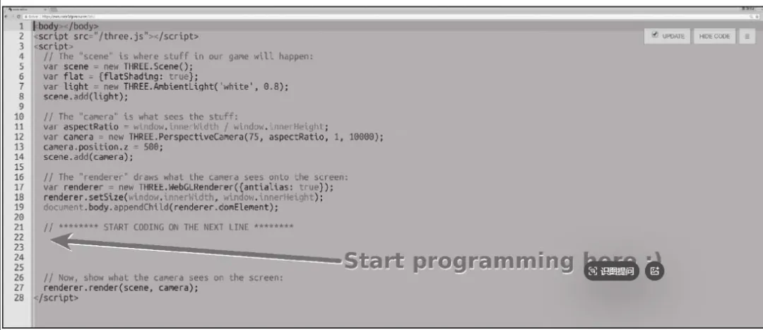 在浏览器的最左边有一串编号。每一行程序代码都有一个编号,从1开始计数,称为“行号”。现在就让我们从第22行开始伟大的编程探险。找到第22行了吗?它就在START CODING ON THE NEXT LINE那一行的下面。如图1.4所示。