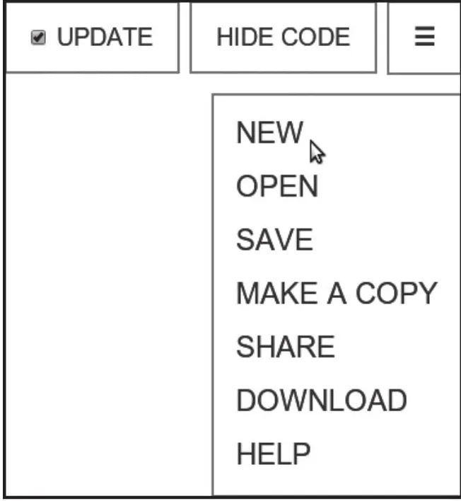 要创建新项目,先要在浏览器右上方找到菜单按钮,就是那个画着三条短横线的按钮。单击该按钮,会出现一个菜单,然后在菜单上单击“NEW”命令,如图1.2所示。单击“NEW”命令后,会出现一个如图1.3所示的小窗口。现在,在“NAME”右侧的白色输入框中,输入项目的名字“Shape”。然后继续向右边看,你可以看到一个“SAVE”按钮。单击这个“SAVE”按钮,新项目就创建好了。