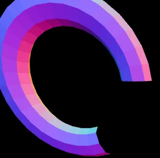 //TorusGeometry甜甜圈//var shape=new THREE.TorusGeometry(100,25,8,25);var shape=new THREE.TorusGeometry(100,25,8,25,5);var cover=new THREE.MeshNormalMaterial(flat);var donut=new THREE.Mesh(shape,cover);scene.add(donut);donut.rotation.set(0.5,0,0);donut.position.set(-250,250,0);