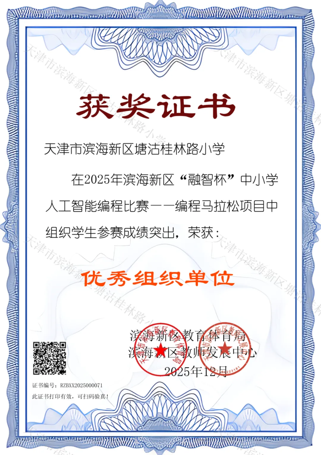 近日,2025年滨海新区“融智杯”中小学人工智能编程比赛——编程马拉松项目顺利收官!作为一场聚焦青少年科技创新能力的高水平赛事,本次比赛汇聚了全区各中小学的编程爱好者,上演了一场精彩绝伦的 “代码较量”。我校学子凭借过硬的编程实力、大胆的创新构想与顽强的拼搏精神,在赛场上奋勇争先,一路过关斩将,成功斩获多项荣誉,为学校赢得了荣光!