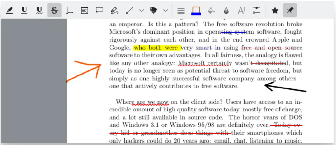 在 轻度编辑 方面,Okular 提供了完善的 注释与标记功能。用户可以在 PDF 文档中进行 高亮、下划线、删除线、手写标注 以及 添加弹出式备注,这些注释 可被保存并随文档一起分享,非常适合 学习笔记、论文批注和技术审阅 等场景。需要注意的是,Okular 并不以全文结构编辑为目标,而是专注于 阅读与批注效率。
