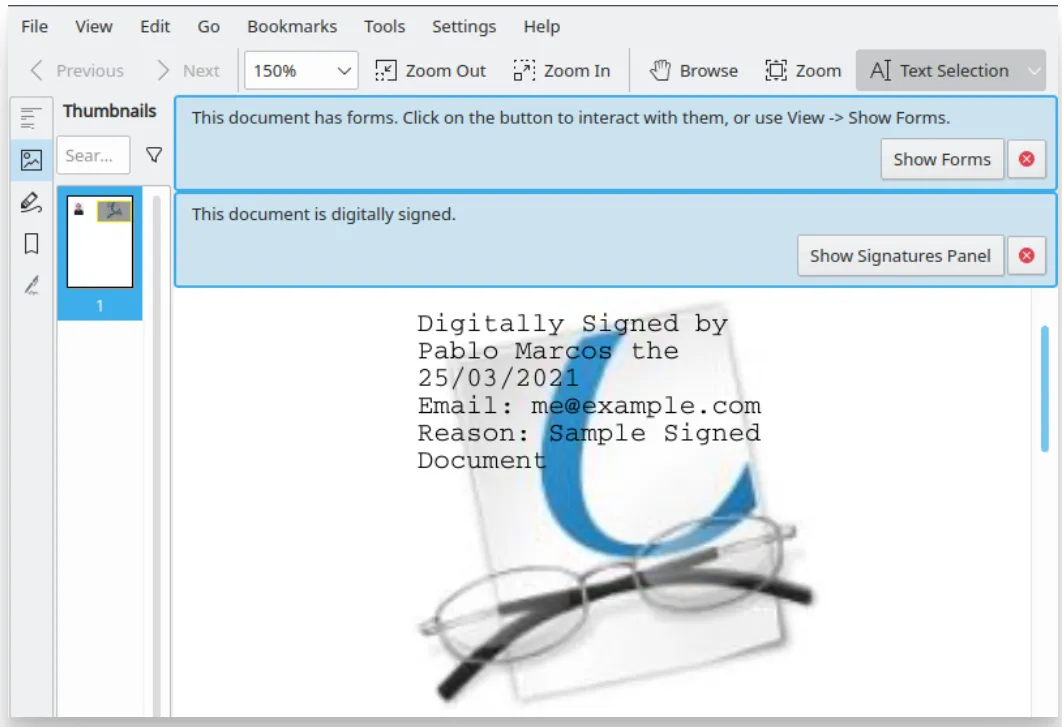 在 安全与专业应用场景 中,Okular 还支持 PDF 表单填写 和 数字签名验证功能。对于包含签名的 PDF 文件,Okular 可以 检查签名的有效性和完整性,这在 学术交流、合同查看以及官方文件阅读 中具有一定实用价值。
