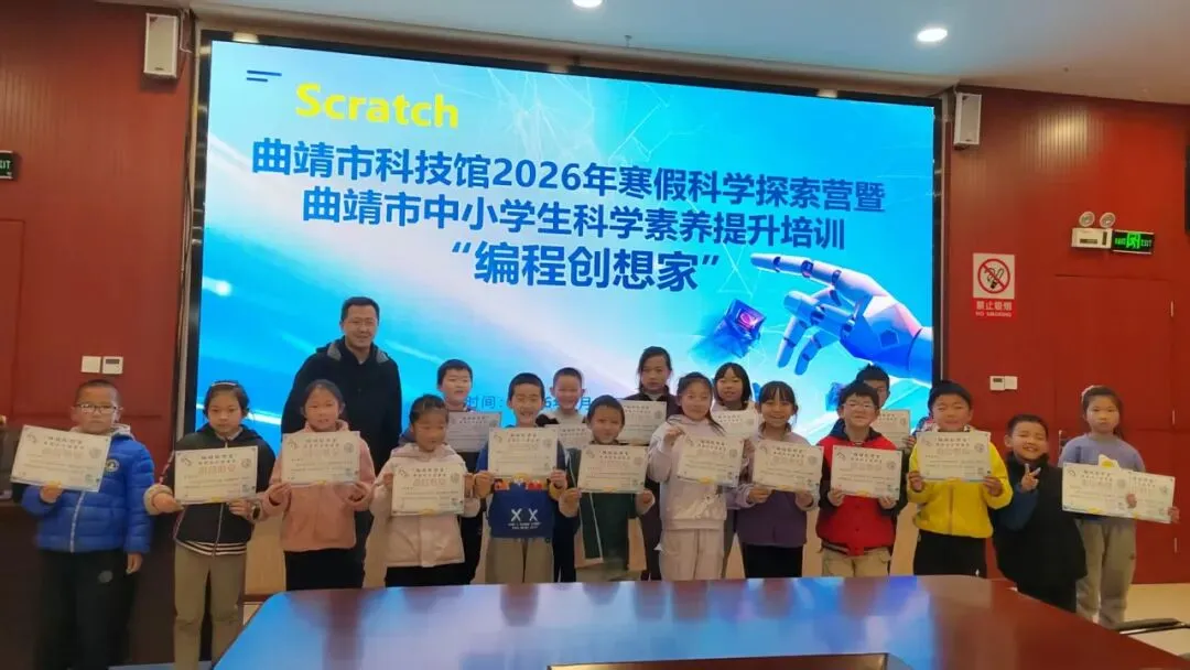 2026年1月28日至2月1日,曲靖市科技馆为期5天的“编程创想家”寒假科学探索营顺利闭营。来自全市的20名9-10岁青少年营员,在麒麟区教育体育局现代教育信息中心主任、省级机器人裁判员杜炳璋老师的带领下,通过7节图形化编程课程与6节趣味科学实验课,动手解锁编程技能、探索科学奥秘,活动最终评选出3名优秀小营员,为寒假科技科普活动画上圆满句号。