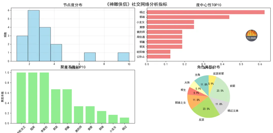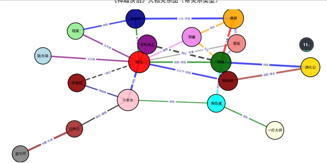 # -*- coding: utf-8 -*-# @Author : 小红牛# 微信公众号:wdPythonimport networkx as nximport matplotlib.pyplot as pltimport matplotlibfrom matplotlib import font_managerimport numpy as np# 设置中文字体plt.rcParams['font.sans-serif'] = ['SimHei', 'Microsoft YaHei', 'DejaVu Sans']plt.rcParams['axes.unicode_minus'] = False# 创建社交网络图G = nx.Graph()# 定义核心人物(节点)core_characters = {'杨过': {'role': '主角', 'importance': 10, 'color': 'red'},'小龙女': {'role': '主角', 'importance': 10, 'color': 'pink'},'郭靖': {'role': '大侠', 'importance': 9, 'color': 'darkgreen'},'黄蓉': {'role': '帮主', 'importance': 9, 'color': 'orange'},'郭芙': {'role': '郭靖之女', 'importance': 7, 'color': 'lightcoral'},'郭襄': {'role': '郭靖之女', 'importance': 8, 'color': 'violet'},'金轮法王': {'role': '反派', 'importance': 8, 'color': 'purple'},'李莫愁': {'role': '反派', 'importance': 7, 'color': 'darkred'},'陆无双': {'role': '杨过义妹', 'importance': 6, 'color': 'lightblue'},'程英': {'role': '杨过义妹', 'importance': 6, 'color': 'lightgreen'},'公孙止': {'role': '反派', 'importance': 6, 'color': 'brown'},'裘千尺': {'role': '反派', 'importance': 6, 'color': 'gray'},'周伯通': {'role': '前辈', 'importance': 7, 'color': 'cyan'},'黄药师': {'role': '前辈', 'importance': 8, 'color': 'darkblue'},'欧阳锋': {'role': '反派前辈', 'importance': 8, 'color': 'maroon'},'洪七公': {'role': '前辈', 'importance': 8, 'color': 'gold'},'一灯大师': {'role': '前辈', 'importance': 7, 'color': 'lightyellow'}}# 添加节点for char, attrs in core_characters.items():G.add_node(char, **attrs)# 定义关系(边)和关系强度relationships = [# 亲情关系('杨过', '小龙女', {'relation': '夫妻', 'strength': 10, 'color': 'red'}),('郭靖', '黄蓉', {'relation': '夫妻', 'strength': 10, 'color': 'red'}),('郭靖', '郭芙', {'relation': '父女', 'strength': 9, 'color': 'orange'}),('黄蓉', '郭芙', {'relation': '母女', 'strength': 9, 'color': 'orange'}),('郭靖', '郭襄', {'relation': '父女', 'strength': 8, 'color': 'orange'}),('黄蓉', '郭襄', {'relation': '母女', 'strength': 8, 'color': 'orange'}),# 师徒关系('郭靖', '杨过', {'relation': '伯侄/师徒', 'strength': 8, 'color': 'green'}),('小龙女', '杨过', {'relation': '师徒', 'strength': 9, 'color': 'blue'}),('欧阳锋', '杨过', {'relation': '义父子/师徒', 'strength': 8, 'color': 'blue'}),('洪七公', '郭靖', {'relation': '师徒', 'strength': 9, 'color': 'blue'}),('黄药师', '黄蓉', {'relation': '父女/师徒', 'strength': 9, 'color': 'blue'}),# 朋友/义兄妹关系('杨过', '陆无双', {'relation': '义兄妹', 'strength': 7, 'color': 'purple'}),('杨过', '程英', {'relation': '义兄妹', 'strength': 7, 'color': 'purple'}),('郭靖', '周伯通', {'relation': '结义兄弟', 'strength': 8, 'color': 'cyan'}),('郭襄', '杨过', {'relation': '敬慕', 'strength': 7, 'color': 'violet'}),# 敌对关系('杨过', '金轮法王', {'relation': '敌对', 'strength': 8, 'color': 'black'}),('郭靖', '金轮法王', {'relation': '敌对', 'strength': 8, 'color': 'black'}),('小龙女', '李莫愁', {'relation': '师姐妹/敌对', 'strength': 7, 'color': 'black'}),('杨过', '李莫愁', {'relation': '敌对', 'strength': 6, 'color': 'black'}),('公孙止', '小龙女', {'relation': '敌对/逼婚', 'strength': 6, 'color': 'black'}),('公孙止', '裘千尺', {'relation': '夫妻/仇敌', 'strength': 9, 'color': 'darkred'}),# 其他重要关系('黄药师', '杨过', {'relation': '忘年交', 'strength': 7, 'color': 'green'}),('周伯通', '小龙女', {'relation': '朋友', 'strength': 5, 'color': 'green'}),('一灯大师', '周伯通', {'relation': '朋友', 'strength': 6, 'color': 'green'}),('洪七公', '欧阳锋', {'relation': '宿敌/挚友', 'strength': 9, 'color': 'brown'}),# 新增的师徒关系('小龙女', '李莫愁', {'relation': '师姐妹', 'strength': 6, 'color': 'darkblue'}),('黄药师', '程英', {'relation': '师徒', 'strength': 7, 'color': 'blue'}),('杨过', '郭芙', {'relation': '世交/矛盾', 'strength': 5, 'color': 'gray'}),]# 添加边for source, target, attrs in relationships:G.add_edge(source, target, **attrs)# 1. 基础社交网络图def plot_basic_network():plt.figure(figsize=(14, 10))# 使用spring布局pos = nx.spring_layout(G, k=2, seed=42)# 根据角色类型设置节点颜色node_colors = [core_characters[node]['color'] for node in G.nodes()]node_sizes = [core_characters[node]['importance'] * 300 for node in G.nodes()]# 根据关系类型设置边颜色edge_colors = [G[u][v]['color'] for u, v in G.edges()]edge_widths = [G[u][v]['strength'] * 0.5 for u, v in G.edges()]# 绘制网络nx.draw_networkx_nodes(G, pos, node_color=node_colors, node_size=node_sizes, alpha=0.9)nx.draw_networkx_edges(G, pos, edge_color=edge_colors, width=edge_widths, alpha=0.7, style='solid')nx.draw_networkx_labels(G, pos, font_size=10, font_weight='bold')plt.title("《神雕侠侣》核心人物社交关系网络", fontsize=16, fontweight='bold')plt.axis('off')plt.tight_layout()plt.show()# 2. 带关系标签的社交网络图def plot_network_with_labels():plt.figure(figsize=(16, 12))# 使用不同的布局算法pos = nx.kamada_kawai_layout(G)# 绘制节点node_colors = [core_characters[node]['color'] for node in G.nodes()]node_sizes = [core_characters[node]['importance'] * 400 for node in G.nodes()]nx.draw_networkx_nodes(G, pos, node_color=node_colors,node_size=node_sizes, alpha=0.9, edgecolors='black', linewidths=2)# 绘制边for u, v, data in G.edges(data=True):nx.draw_networkx_edges(G, pos, edgelist=[(u, v)],width=data['strength']*0.6,edge_color=data['color'],alpha=0.7,style='dashed' if data['relation'] in ['敌对', '仇敌'] else 'solid')# 添加节点标签nx.draw_networkx_labels(G, pos, font_size=11, font_weight='bold')# 添加关系标签edge_labels = {(u, v): data['relation'] for u, v, data in G.edge