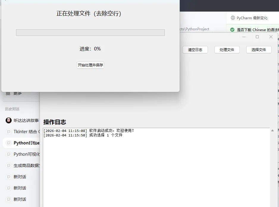 要实现一个功能更复杂、接近实际项目场景的 Python 程序(适合打包演示),我下面回提供一个包含「多窗口、文件操作、数据保存、进度条」的 Tkinter 程序(相比之前的简单 demo,功能更全面、场景更真实),同时搭配完整的打包方案和优化技巧,让你能打包出一个「可用的复杂软件」。