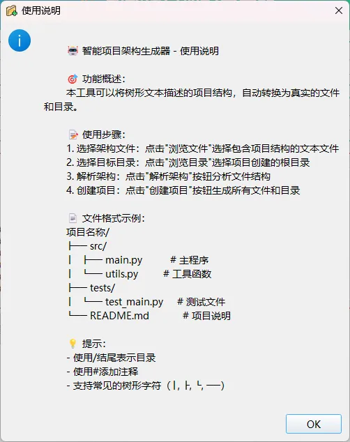 在软件开发中,项目结构的搭建往往是重复而繁琐的任务。每次新建项目都要手动创建数十个文件和文件夹,不仅效率低下,还容易出错。今天,我将分享一个革命性的解决方案——基于Python+PyQt5的智能项目架构生成器,它能够将简单的树形文本描述瞬间转化为完整的项目结构。