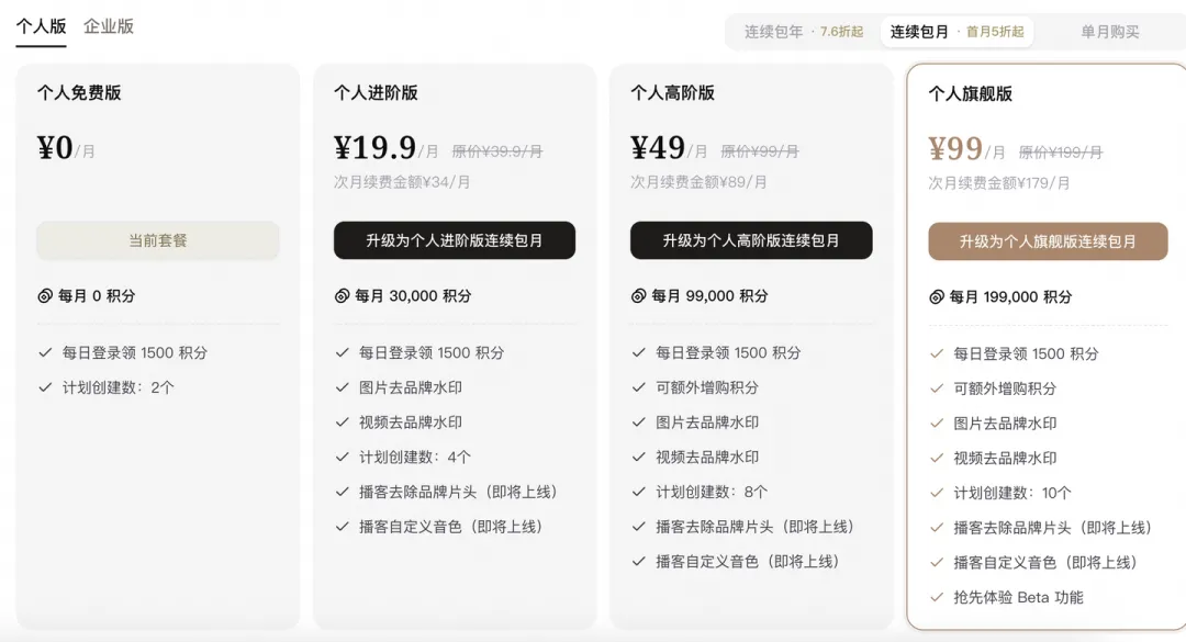 Coze 采用“积分(Points)”体系,将核心能力(如模型调用、工具使用、知识库容量等)统一转换为可消费的“积分”,通过不同套餐提供差异化配额。