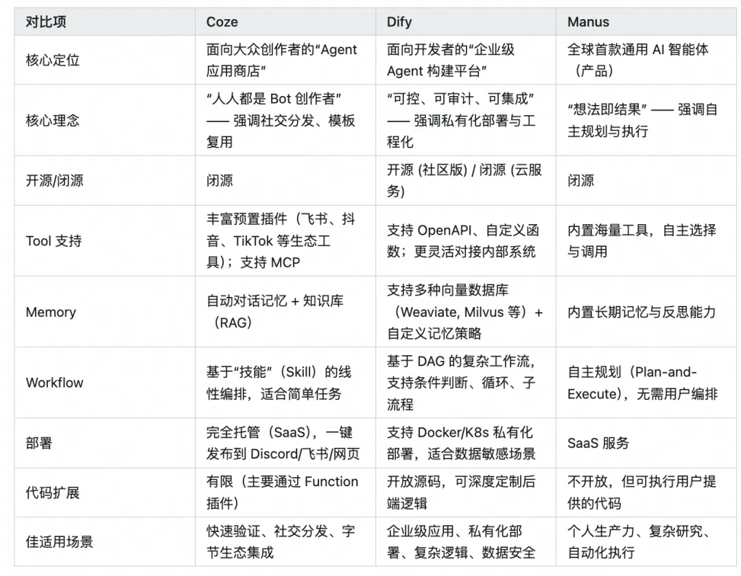 本篇文章将聚焦这一趋势,剖析低代码平台如何封装 Agent 的核心能力,并以字节的 Coze、开源的Dify、被Meta收购的Manus 为例,对比其设计理念、功能差异与适用场景。