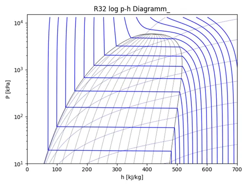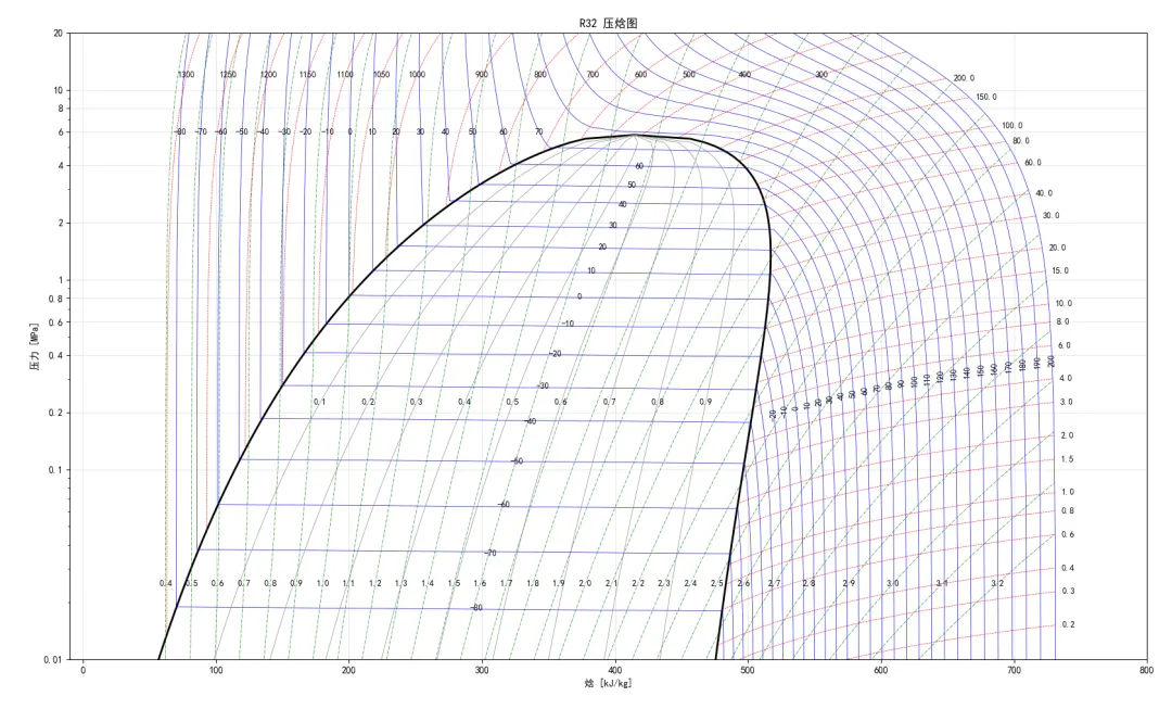 这个示例中,四行代码生成了一个R32的压焓图,coolprop中默认压焓图只有等干度线、等温线和等熵线,无等密度线,且等值线的数量、颜色、线型等均为系统默认。