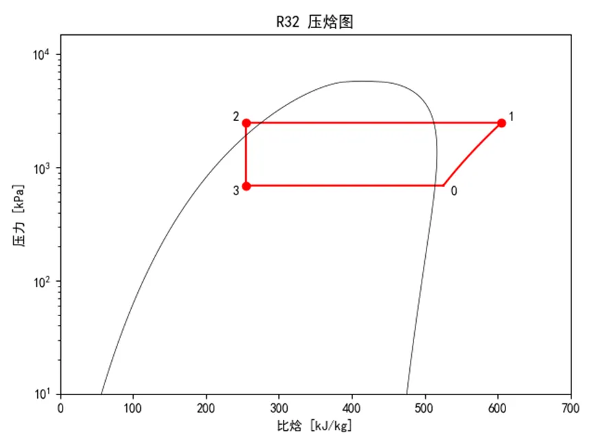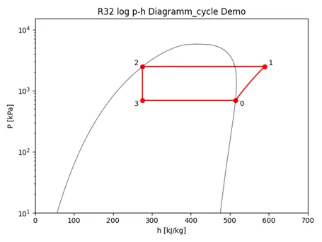 这个示例中,压焓图仅保留饱和线,并在压焓图上生成了一个简单的制冷循环过程,添加状态点标注。 这里引用到的是SimpleCompressionCycle模块,它是coolprop内置的一个简单压缩循环模块,除了已知蒸发温度/压力和冷凝温度/压力求解外,还可以通过蒸发温度/过热度和冷凝温度/过冷度求解,不过状态点state限制为4个。
