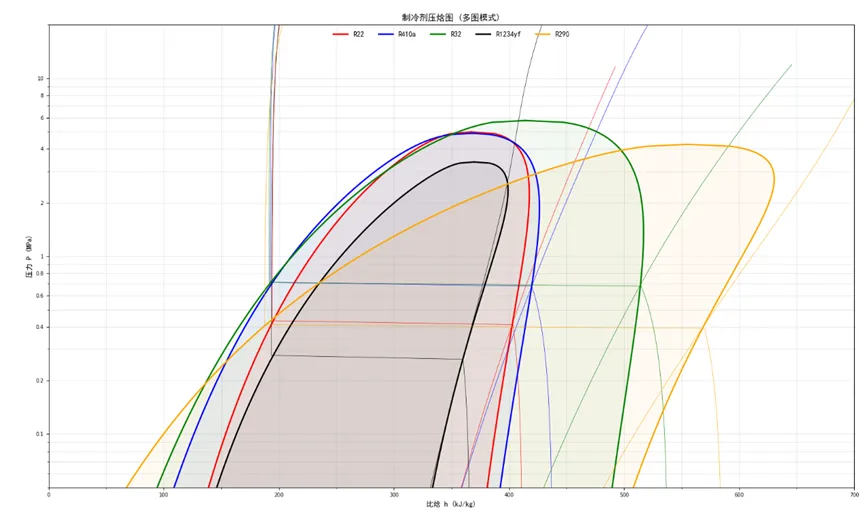 在这个示例中,我们将R22,R410a,R32,R1234yf和R290共5种制冷剂的压焓图绘制在一张图上。