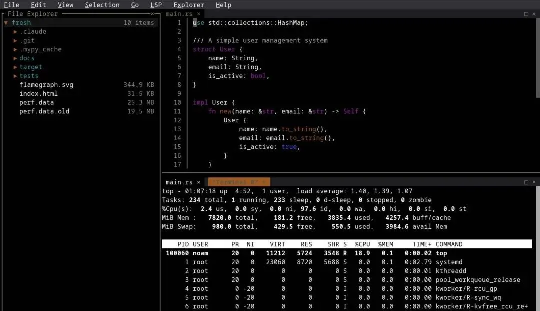 同时内置了命令面板、多光标编辑和 LSP 支持,在纯终端环境下也能拥有代码补全和语法高亮。