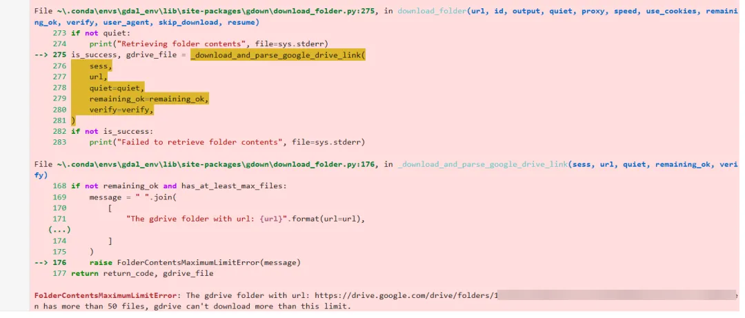 FolderContentsMaximumLimitError: The gdrive folder with url:https://drive.google.com/drive/folders/1*************usp=drive_link&hl=en has more than 50 files, gdrive can't download more than this limit.这一限制在科研数据场景中尤为常见,如逐日遥感产品、逐月气象数据或模型批量输出结果,往往包含成百上千个文件。