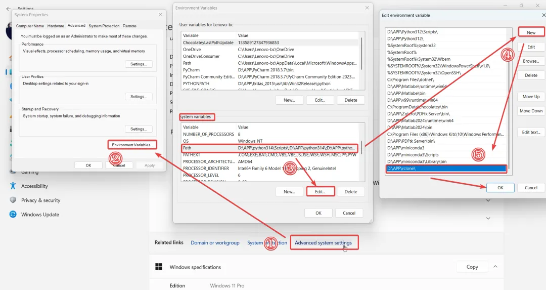 方案B:假设将 rclone 解压至:D:\APP\rclone,则该目录下存在:D:\APP\rclone\rclone.exe,而后我们需要配置一些环境变量,如下操作:此电脑 → 右键 → 属性 → 高级系统设置→ 环境变量,具体步骤如下图所示:
