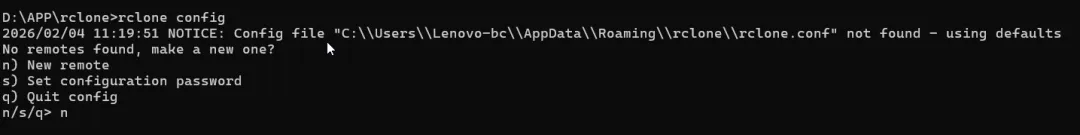 rclone config我们便可以看到如下页面,我们输入n而后新建一个remote,这里我将名称设置为了GoogleDriveDownloda:
