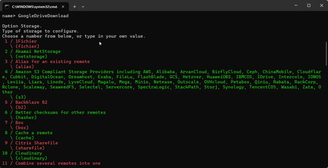 新建完成之后我们便会看到如下页面,我们找到Google Drive,这里是24,我们便输入24,紧接着client_id、client_secret 直接回车: