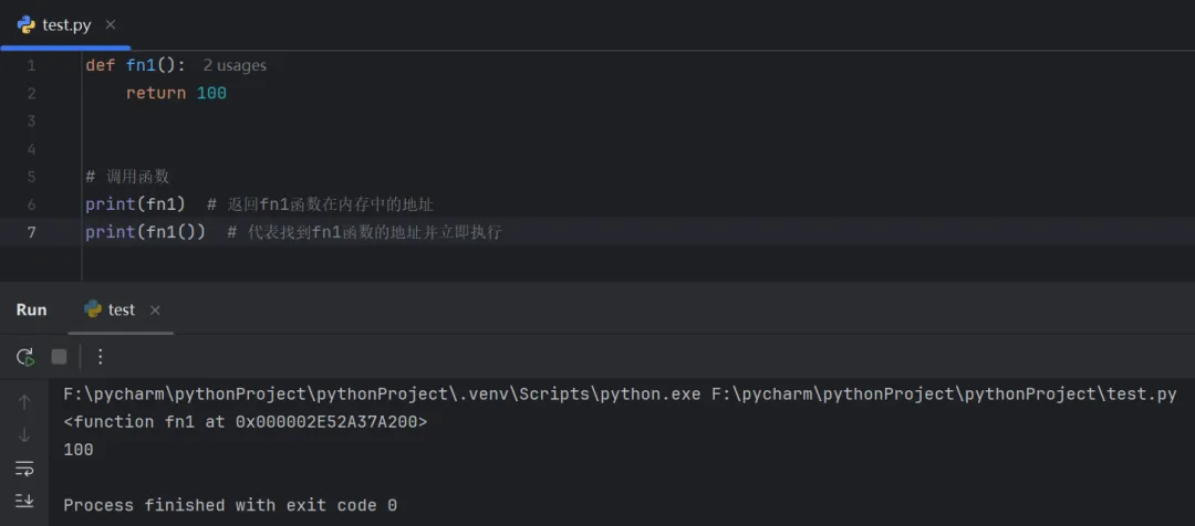 def fn1(): return 100# 调用函数print(fn1) # 返回fn1函数在内存中的地址print(fn1()) # 代表找到fn1函数的地址并立即执行