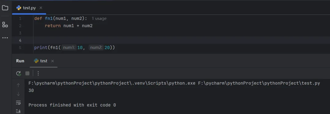 def fn1(num1, num2):return num1 + num2print(fn1(10, 20))