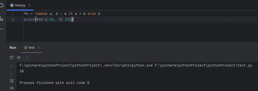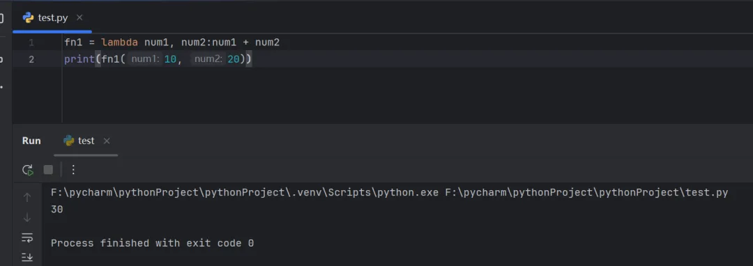 fn1 = lambda num1, num2:num1 + num2print(fn1(10, 20))