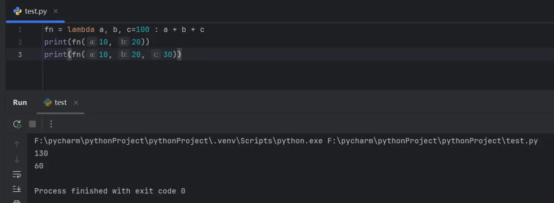 fn = lambda a, b, c=100 : a + b + cprint(fn(10, 20))print(fn(10, 20, 30))