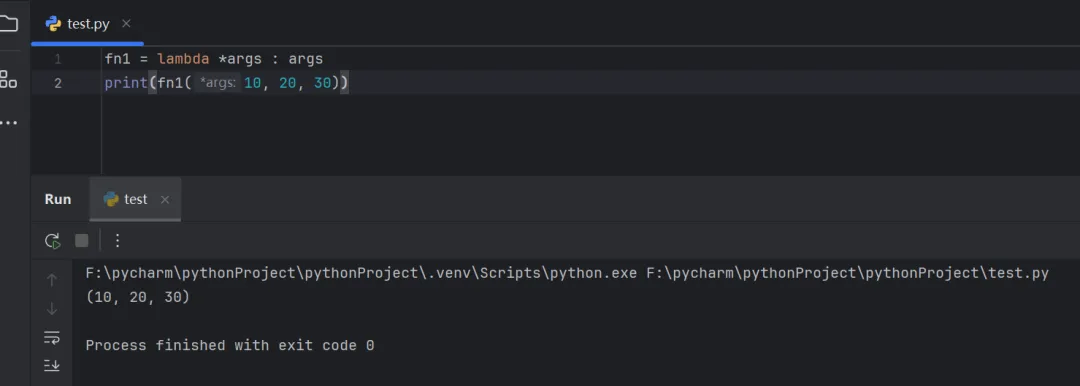 fn1 = lambda *args : argsprint(fn1(10, 20, 30))