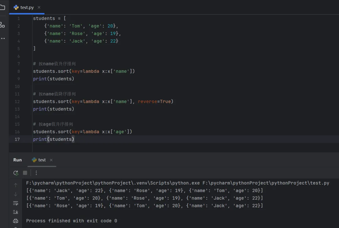 students = [ {'name': 'Tom', 'age': 20}, {'name': 'Rose', 'age': 19}, {'name': 'Jack', 'age': 22}]# 按name值升序排列students.sort(key=lambda x:x['name'])print(students)# 按name值降序排列students.sort(key=lambda x:x['name'], reverse=True)print(students)# 按age值升序排列students.sort(key=lambda x:x['age'])print(students)
