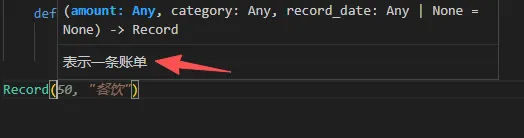 from datetime import dateclass Record: """表示一条账单""" def __init__(self, amount, category, record_date=None): self.amount = amount self.category = category self.record_date = record_date or date.today() def __str__(self): """返回账单的可读字符串""" return f"{self.record_date} | {self.category} | ¥{self.amount}"class AccountBook: """账本,用来管理多条账单""" def __init__(self): self.records = [] """新增账单""" def add_record(self, record): self.records.append(record) # 总计 def total_amount(self): return sum(record.amount for record in self.records) # 查看 def show_records(self): if not self.records: print("暂无记账记录") return for record in self.records: print(record)book = AccountBook()r1 = Record(30, "早餐")r2 = Record(120, "买书")r3 = Record(50, "打车")book.add_record(r1)book.add_record(r2)book.add_record(r3)book.show_records()print("总支出:", book.total_amount())