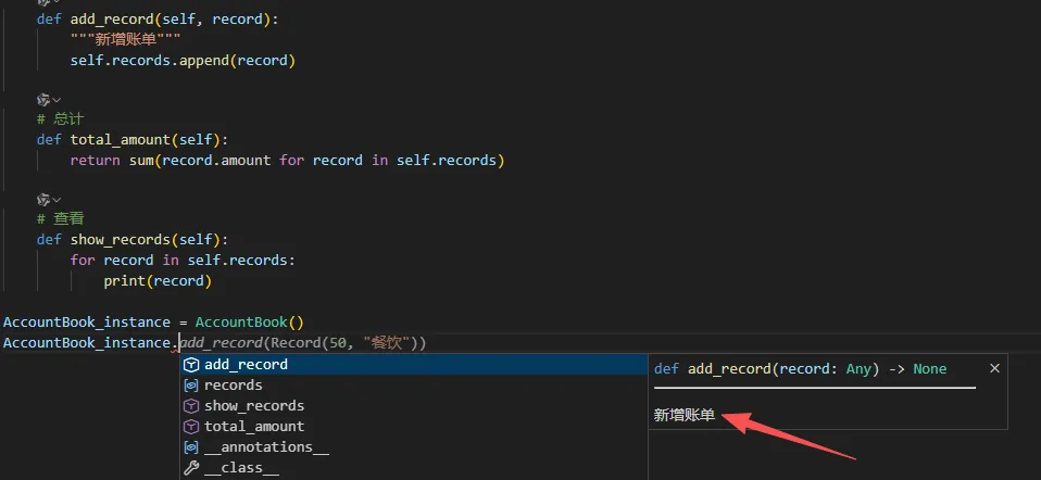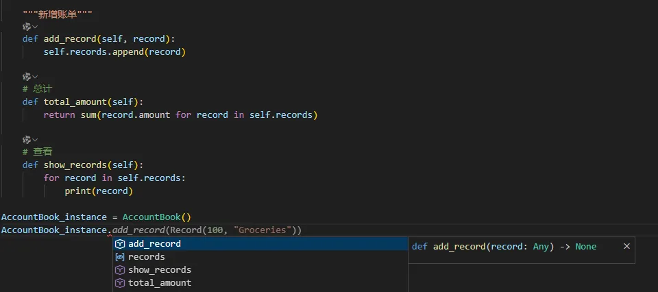 book = AccountBook()r1 = Record(30, "早餐")r2 = Record(120, "买书")r3 = Record(50, "打车")book.add_record(r1)book.add_record(r2)book.add_record(r3)book.show_records()print("总支出:", book.total_amount())