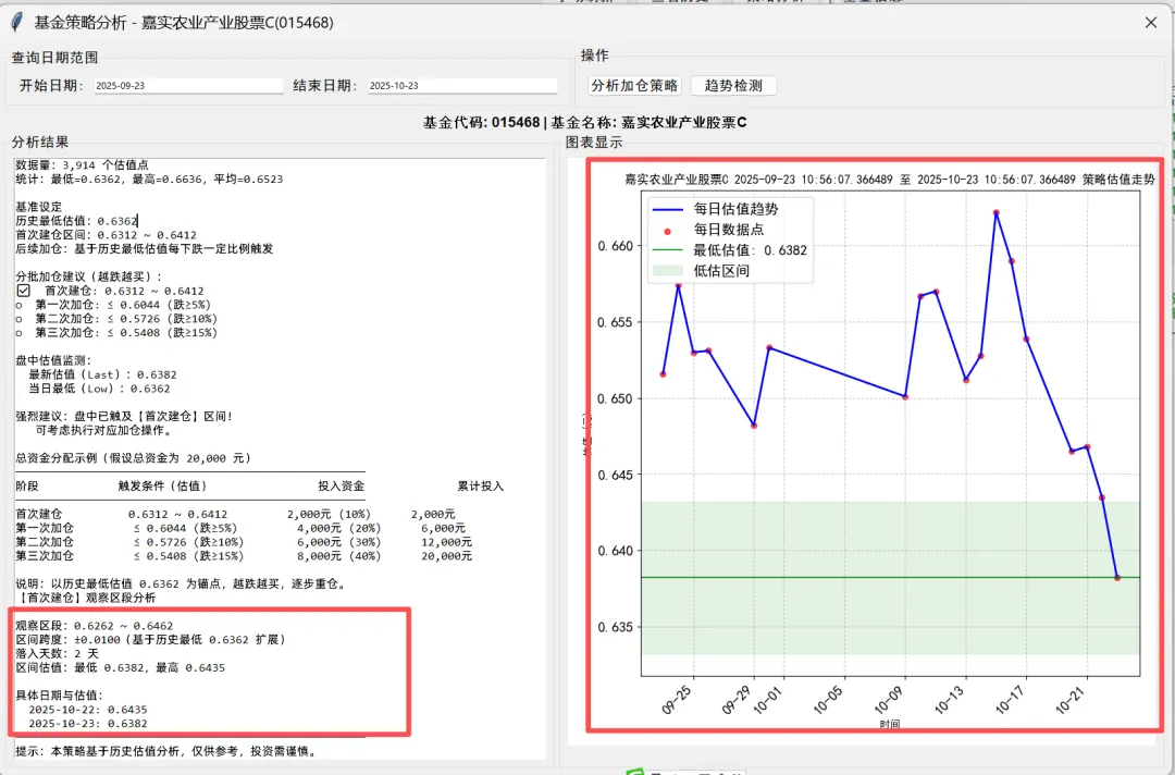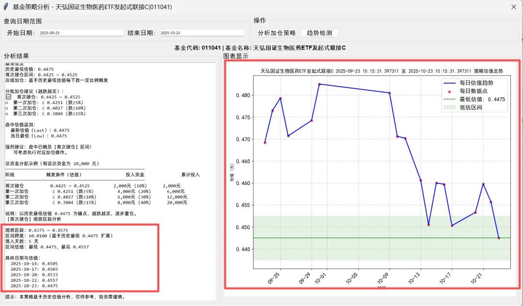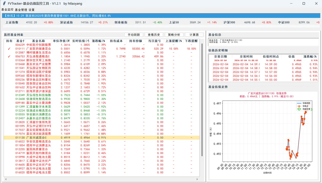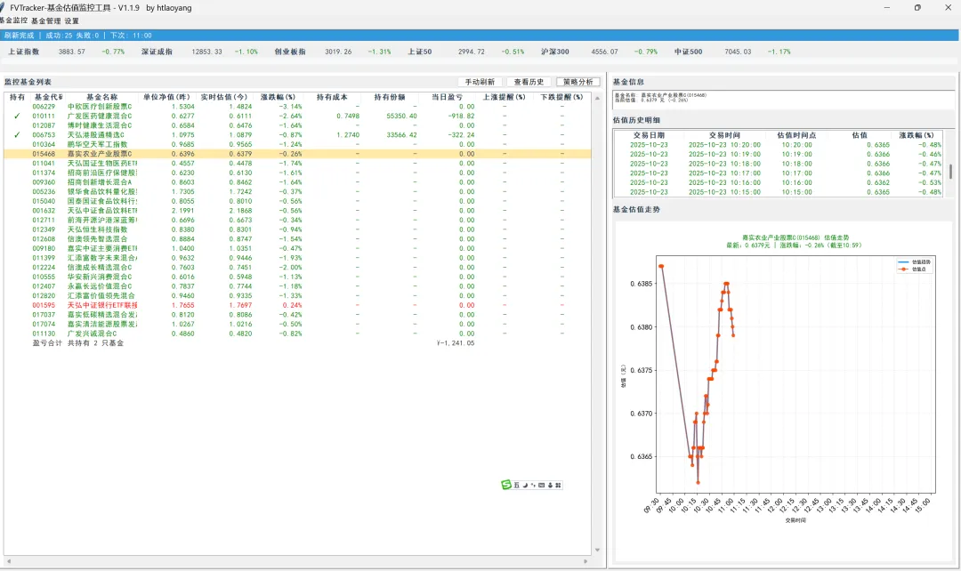 FVTracker 是一个基于Python的基金估值跟踪工具,接口数据来源于网上公开的API; 项目初衷主要是获取基金每天实时估值记录,用于分析及提供一些特定策略。 对于估值在底部震荡基金,提出一个分批加仓策略建议;帮助用户证验自已的操作理念或是提供回本执行计划; 仅供学习参考,投资需谨慎。
