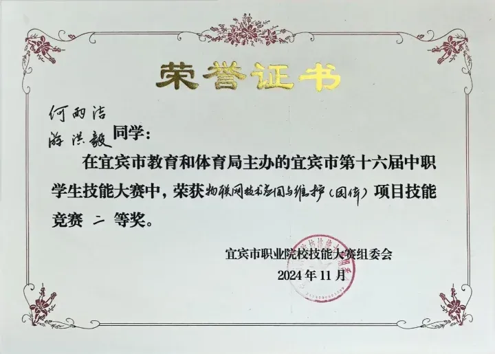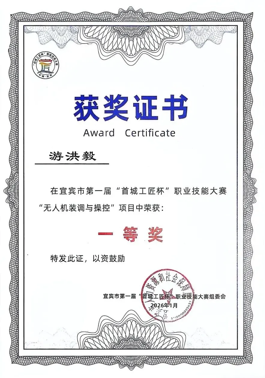 这些奖项见证了他从编程少年到技能能手的蜕变,也让他在2026年1月的宜宾市“首城工匠杯”的赛场上厚积薄发,最终斩获一等奖。▲技能大赛奖状和奖杯
