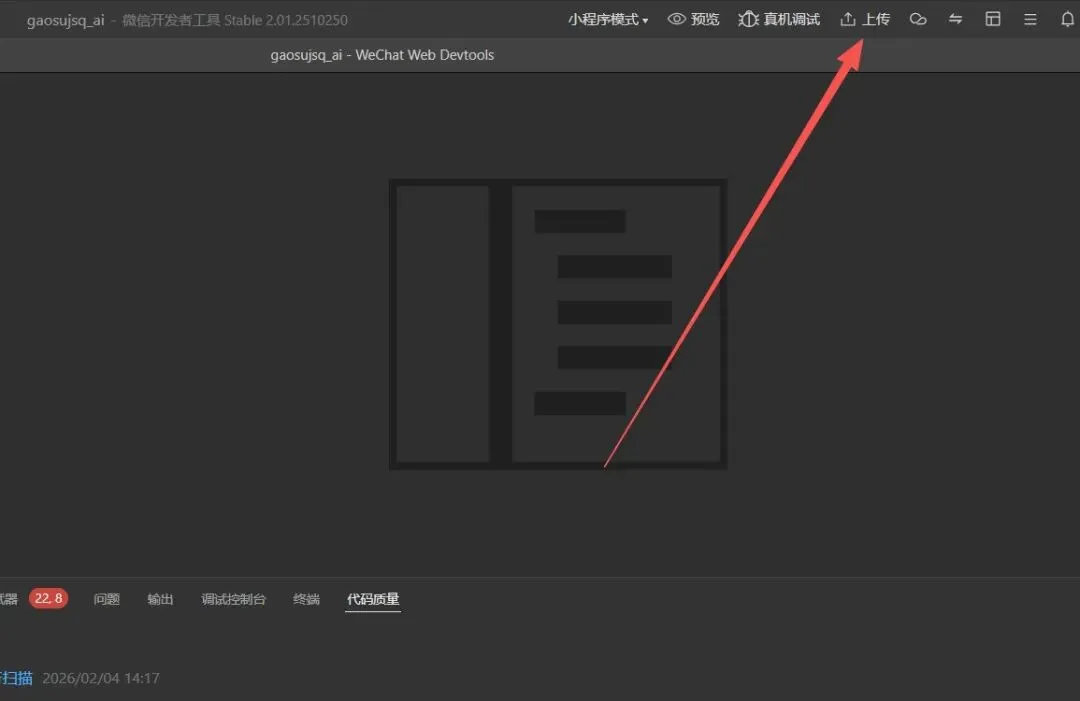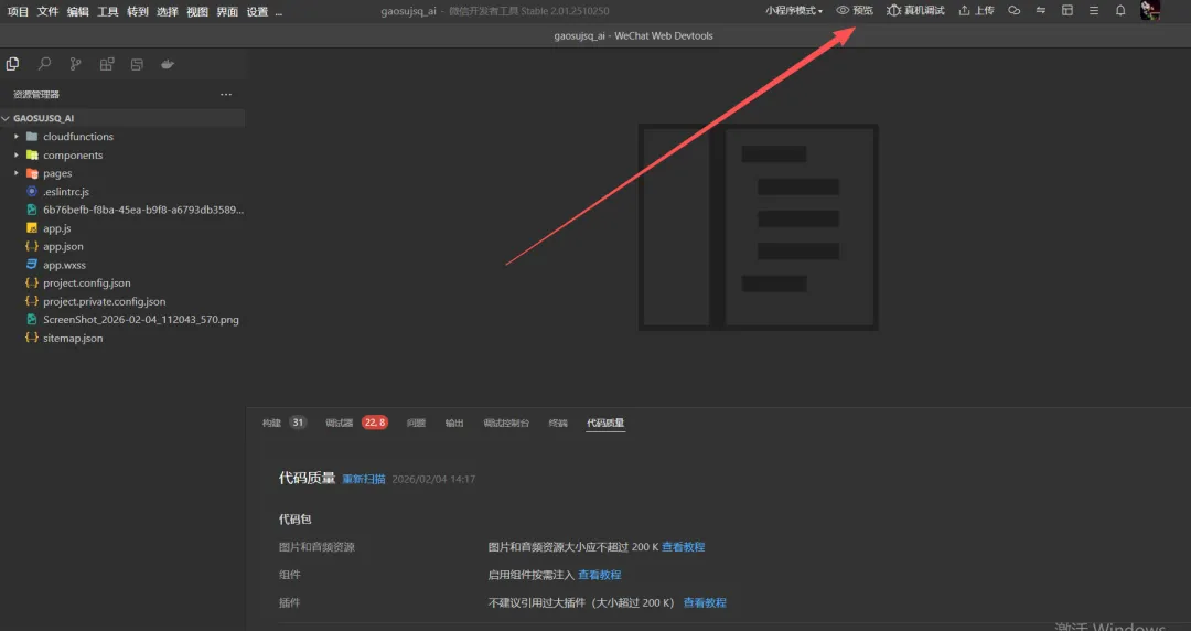 代码开发完成后,可以进行调试预览,看看有没有问题,打开小程序开发工具(不是AI开发工具),页面上方有调试、预览等按钮,