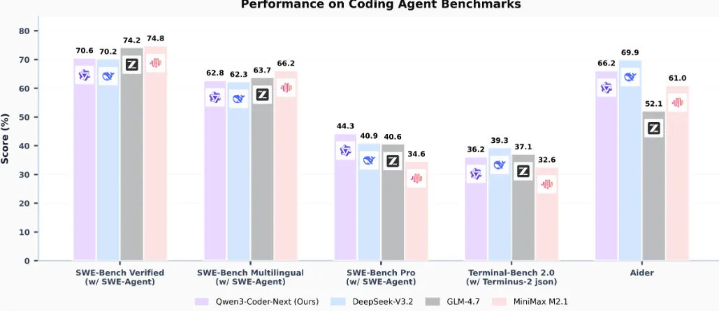 有了高质量的模拟真实功臣任务的合成训练数据,加上强大高效的训练基础设施,Coder3-Coder-Next 才能取得如此成果。
