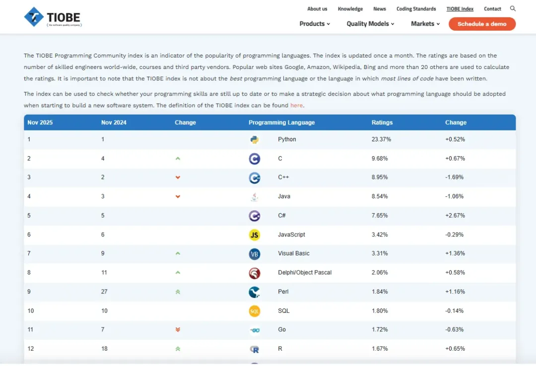 - 内存安全语言受重视:美国白宫发布网络安全报告,呼吁用Rust、Go等“内存安全”语言替代C、C++——这类语言就像给代码加了“安全锁”,能避免很多安全漏洞。反映在榜单上,Rust从去年的第18名飙升到第11名,而C语言排名大幅下滑;