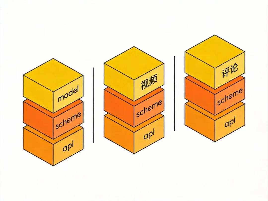 用户功能 = models/user.py + schemas/user.py + api/users.py视频功能 = models/video.py + schemas/video.py + api/videos.py评论功能 = models/comment.py + schemas/comment.py + api/comments.py