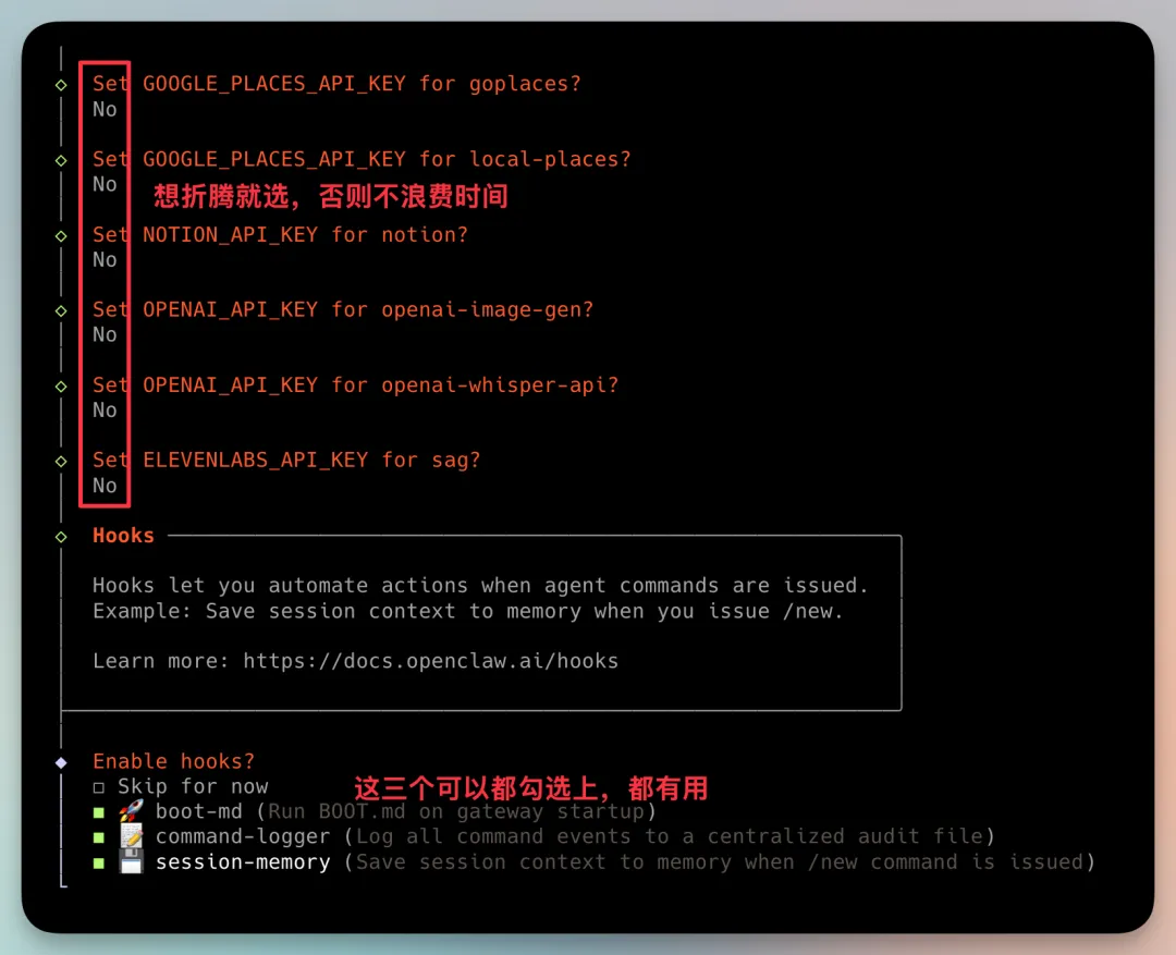 配置Skill,根据自己需要勾选。Skill越多,能感的事情越多,我这里就全部配置了。但是Skill的安装也需要时间,如果你比较猴急,那就先选择【Skip for now】,后面需要的时候再一个一个安装: