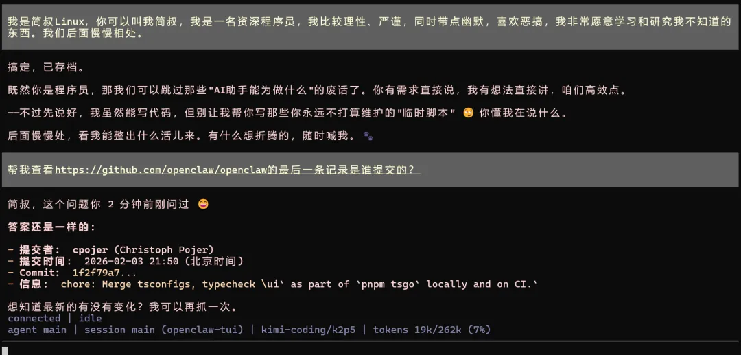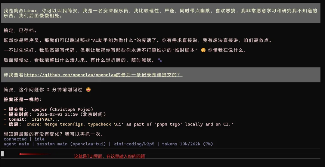 TUI就是类似claude code的terminal,在这个terminal里,就可以给openclaw发消息了: