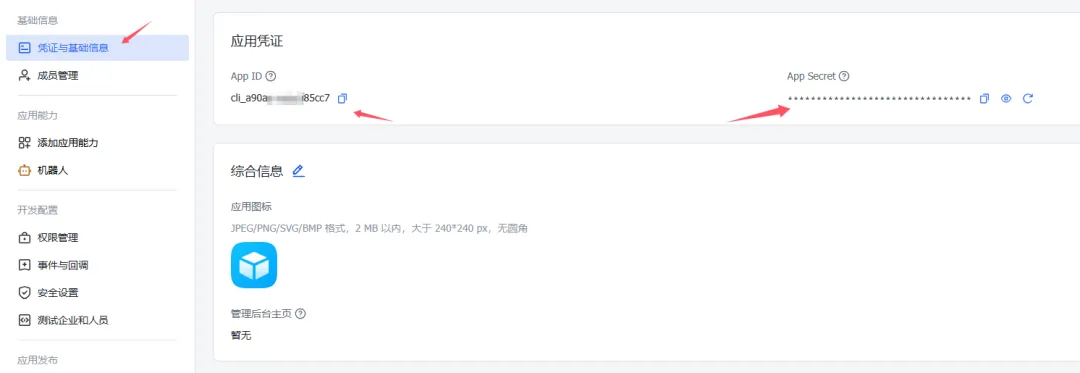 在应用的「凭证与基础信息」页面复制 App ID 和 App Secret。