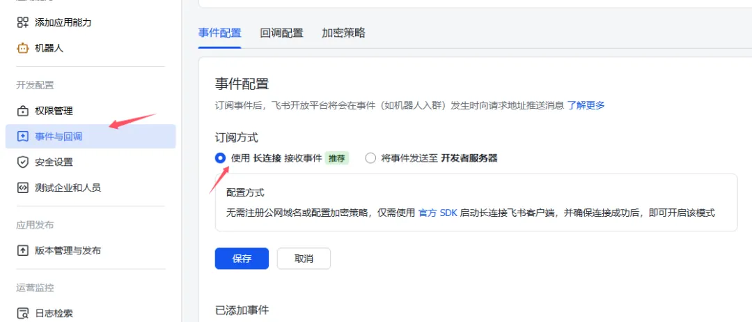 事件配置和回调配置中,订阅方式都选“长链接”: