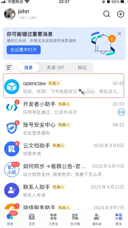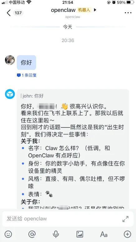部署好之后,就可以通过飞书来和openclaw这个bot来交互了。