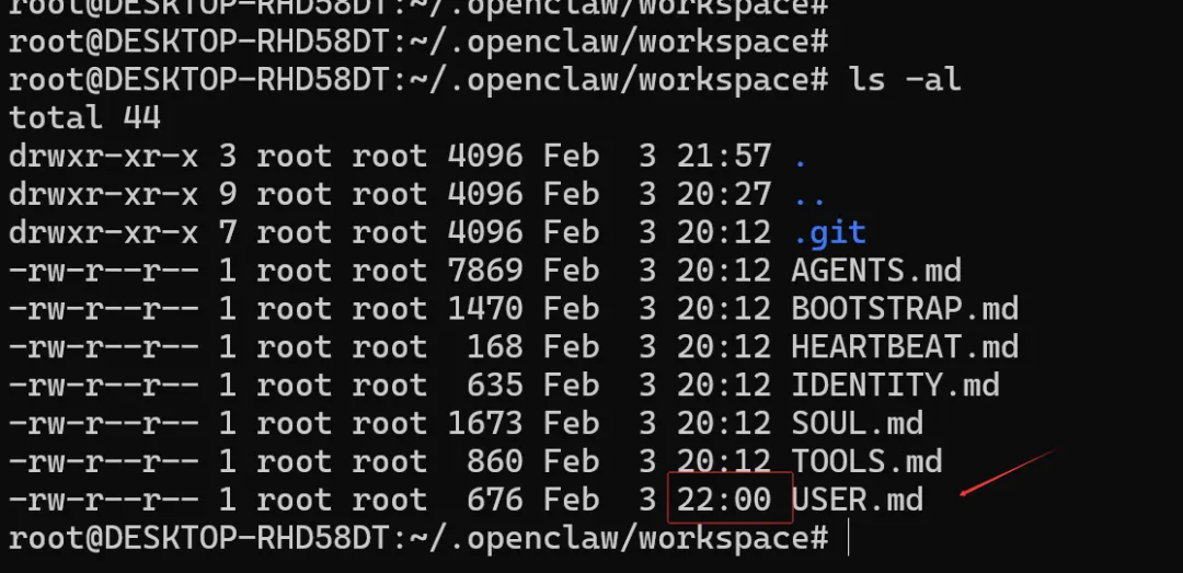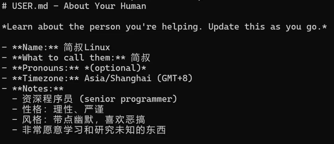 以上的聊天刚结束,~/.openclaw/workspace/USER.md文件就被更改了: