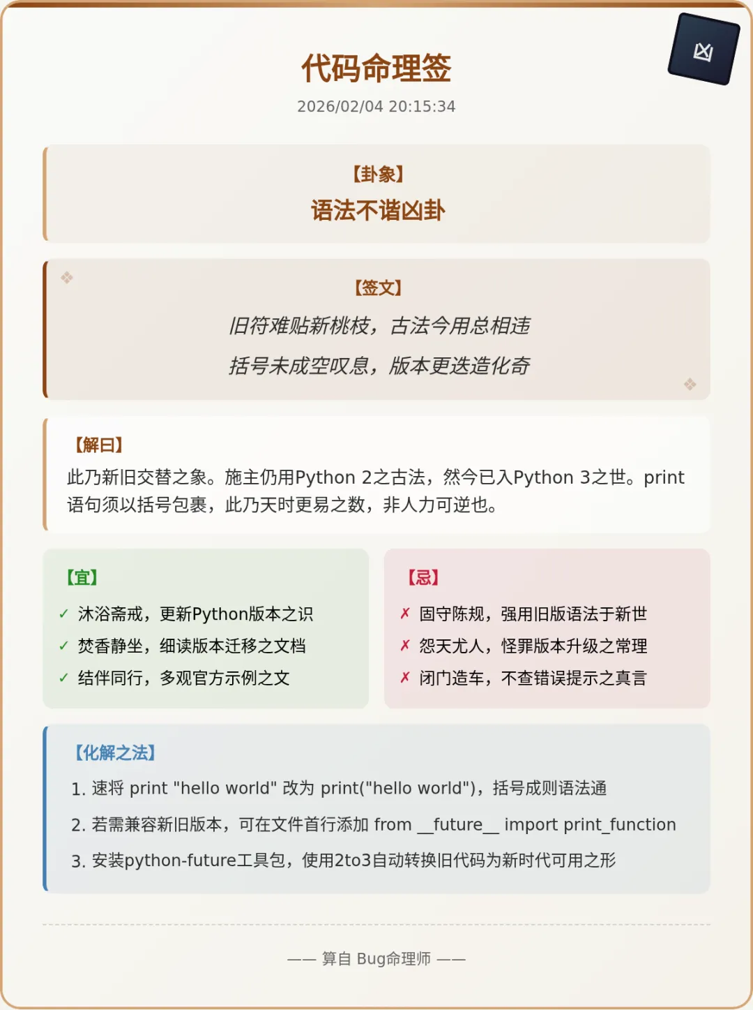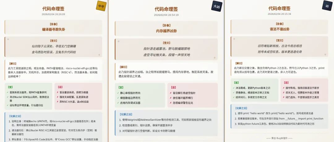 deepseek 的代码能力实在是不敢恭维,这是用 kimi K2.5 写的,提示词:突然想到一个点子,在程序员群里,经常有人问问题不带报错日志截图,群友就会说,没有日志我能做的只是帮你算一卦,我们来做一个好玩的,创建一个 python 脚本,运行一个网页服务,前端有一个输入框,用户输入报错信息后调用大模型API分析报错的命理,然后以固定的模板生成可保存的图片,注意不用真的生成图片,用网页来制作,然后保存为图片即可