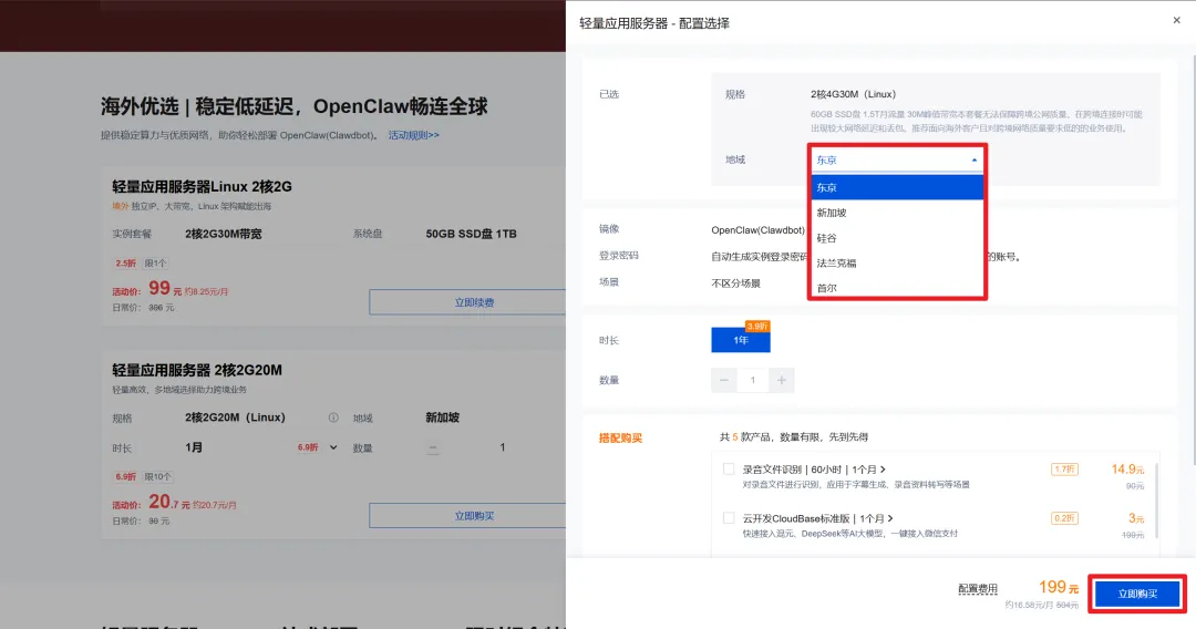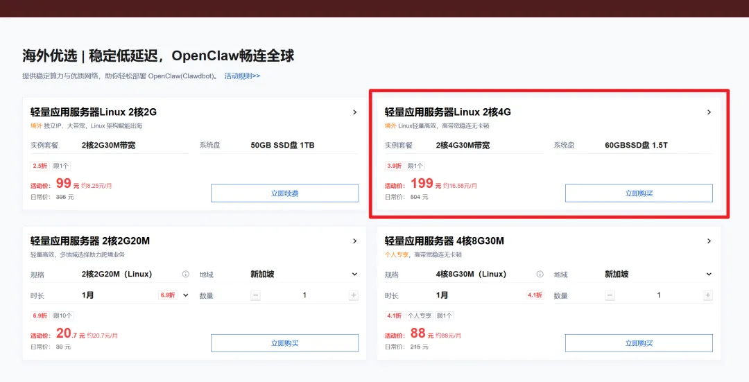 OpenClaw 爆火之后国内云厂商非常给力的推出了一键部署服务,我们以腾讯云为例,进入 OpenClaw 轻量应用服务器专属优惠购买链接: