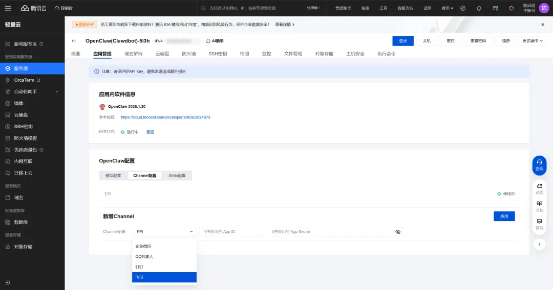 在【channel配置】中可以选择配置企业微信、QQ机器人、钉钉、飞书等不同的机器人