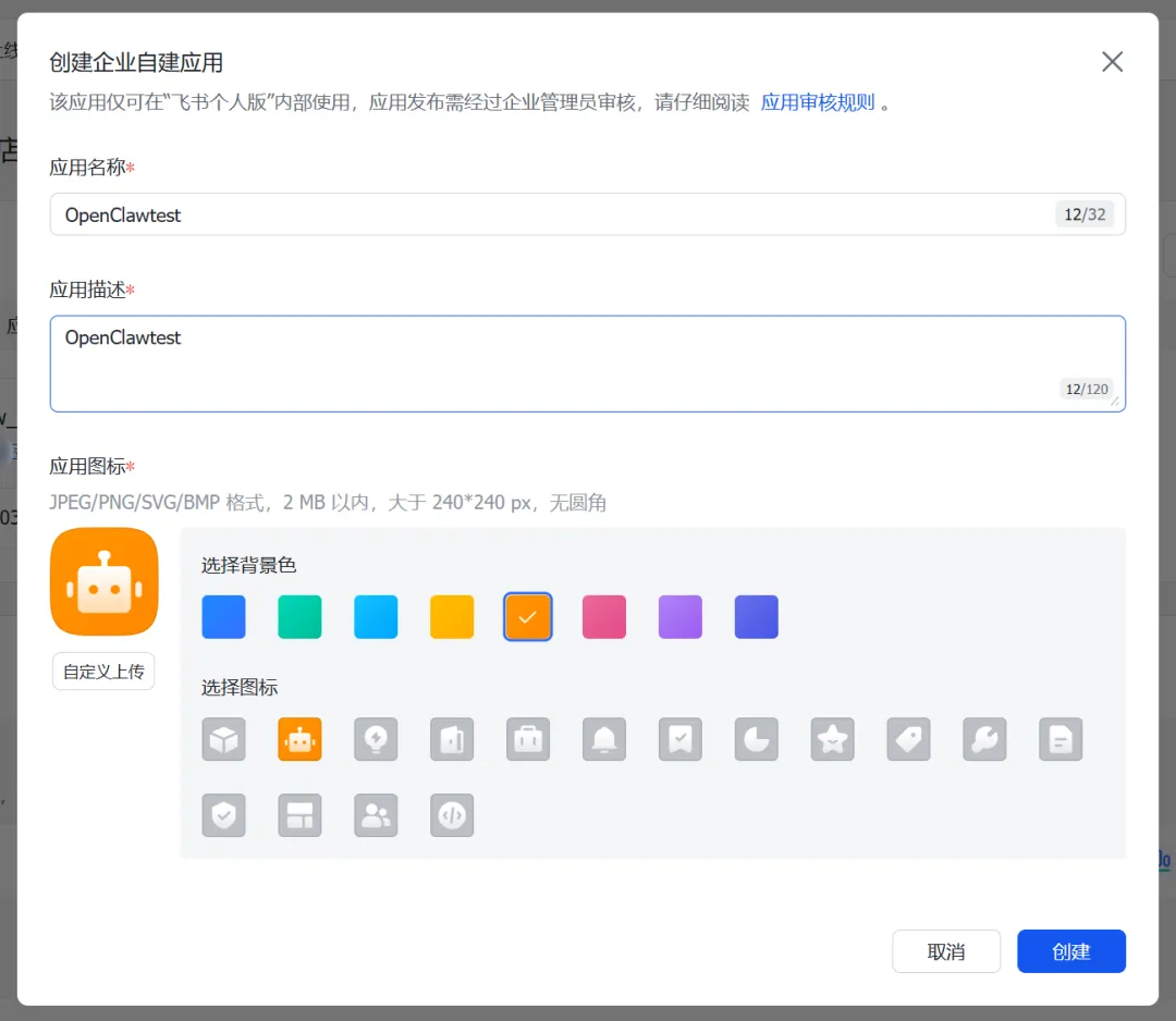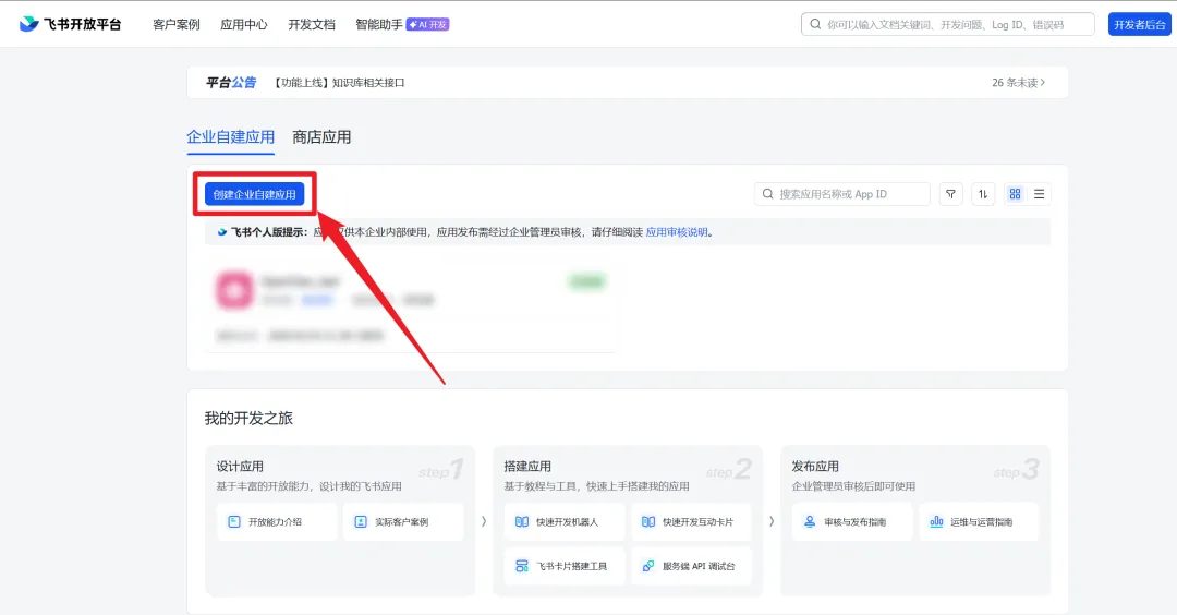 以飞书机器人为例,登录飞书开放平台,选择【创建企业自建应用】: