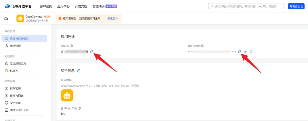 在【凭证与基础信息】中找到应用凭证,将机器人的【App ID】以及【App Secret】复制到OpenClaw 应用管理界面的 Channel 中并【应用】