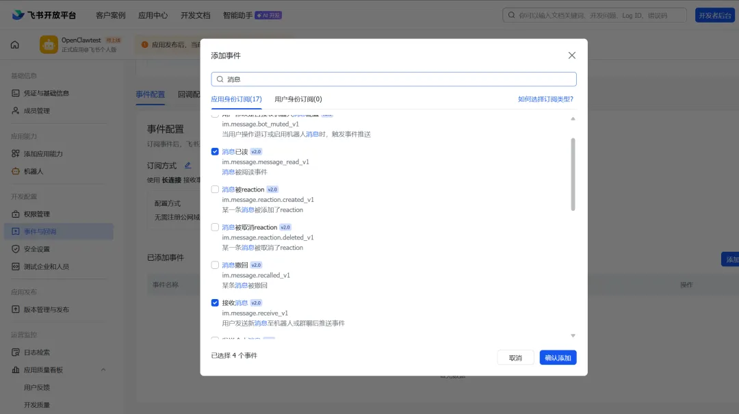 保存后点击【添加事件】在弹出的列表中,勾选【接收消息】、【消息已读】、【机器人进群】、【机器人被移出群】,点击 【确认添加】