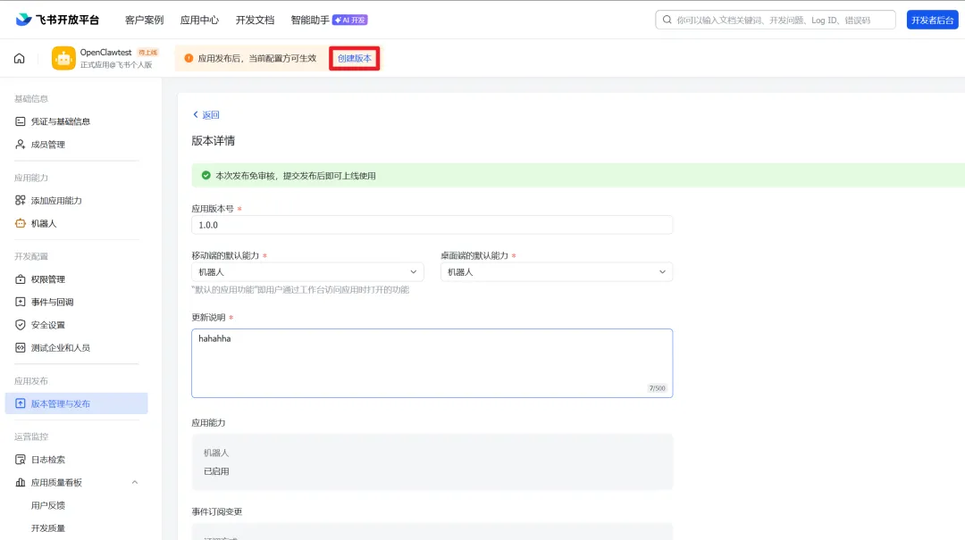 最后【创建版本】发布,版本号等信息随意填写,拖到最下面点击保存并确认发布