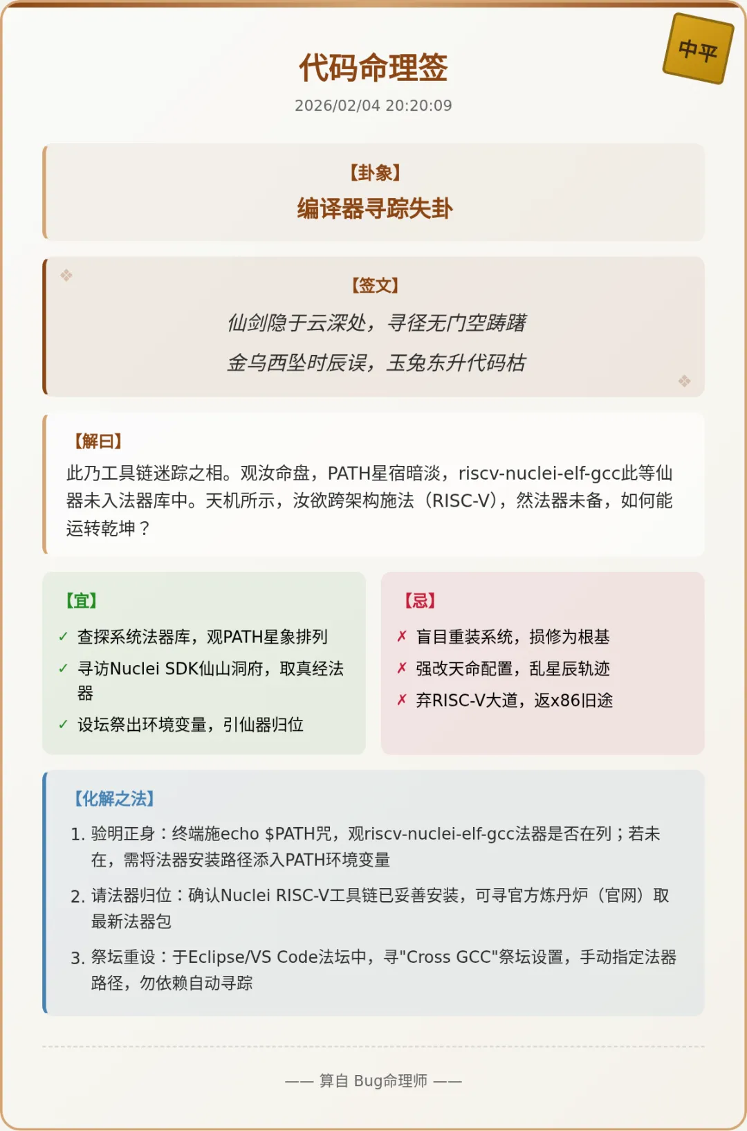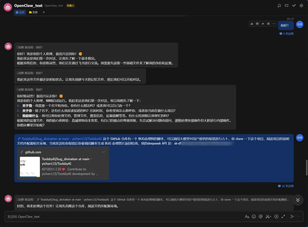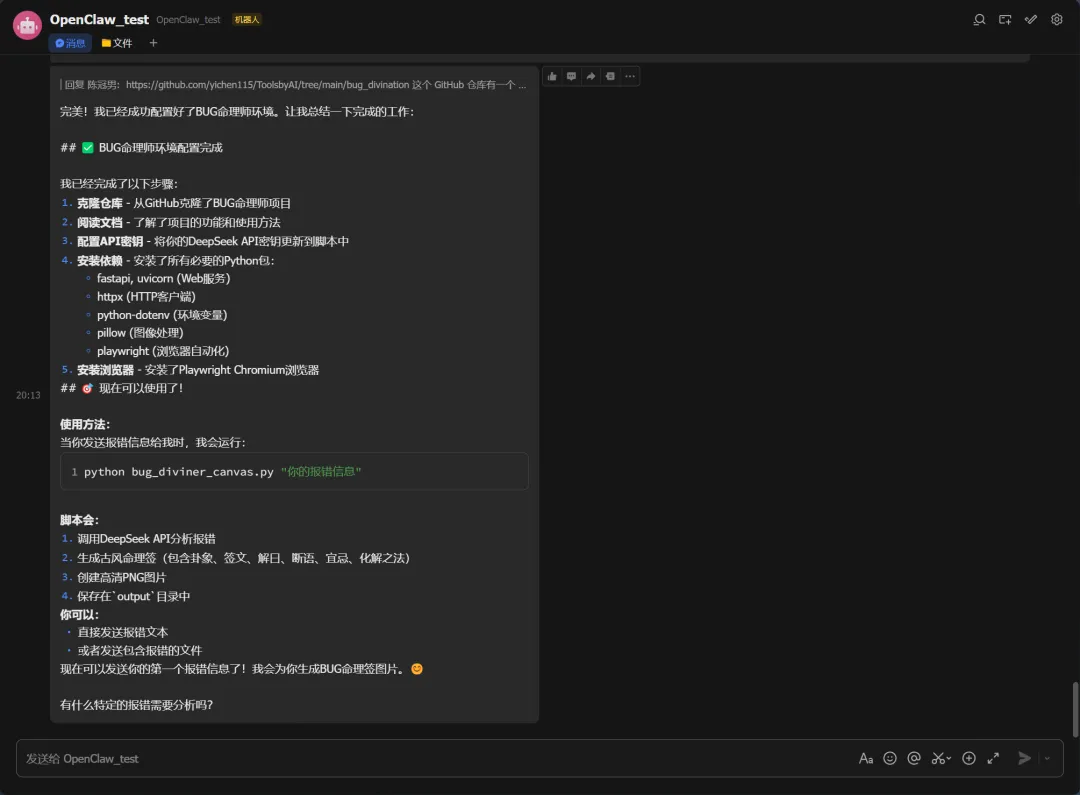 最新版本我已经上传到 github 了,可以直接让你的 OpenClaw 下载代码自己安装依赖并运行啦:https://github.com/yichen115/ToolsbyAI/tree/main/bug_divination 这个 GitHub 仓库有一个 BUG命理师的脚本,可以调用大模型对用户提供的报错进行占卜,你 clone 一下这个项目,阅读项目的说明文档并配置相关环境,当我发送给你报错后你要调用脚本生成 BUG 命理图片返回给我,我的deepseek API 是:xxxxxxxxxxxxx