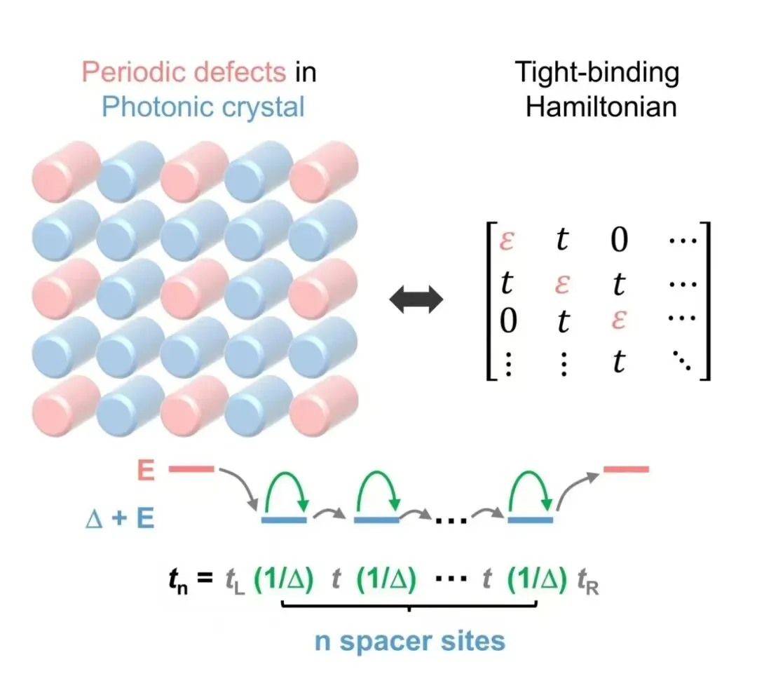 针对这一挑战,团队在前期光子晶体研究(Phys. Rev. Lett., 135, 083803,2025)的基础上,进一步提出了基于“缺陷调控超晶格”的新策略。该方案在具有光子带隙的背景晶格中引入周期性缺陷,利用带隙对光场的强局域效应,将缺陷模式塑造为彼此隔离的“人工原子”,并通过倏逝场隧穿实现最近邻耦合,从而使体系天然满足紧束缚模型条件。更关键的是,通过设计缺陷间的“间隔单元”参数,可以像“搭积木”一样对耦合强度与符号进行自由编程。这相当于让光在若干“中介单元”传输,多级中介的干涉与失谐共同决定最终等效耦合的幅度与相位。